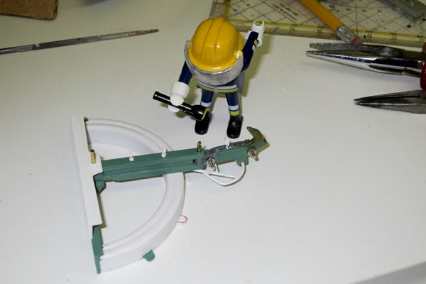 Entsprechend sind die beiden äusseren Wellenhalterungen entweder in der Luft, oder die Wellen müssen durchgebogen werden (sind drum weiche Aluröhrchen dabei gewesen?). Entsprechend habe ich die äusseren Wellenhalterungen mit einem zusätzlichen Kunstoffboden verstärkt. Die Seilwinde wurde ebenfalls grün Grundlackiert, dann in verschiedenen Schritten gealtert; alles in Airbrushtechnik. Die Winden wurden mit Rost versehen.